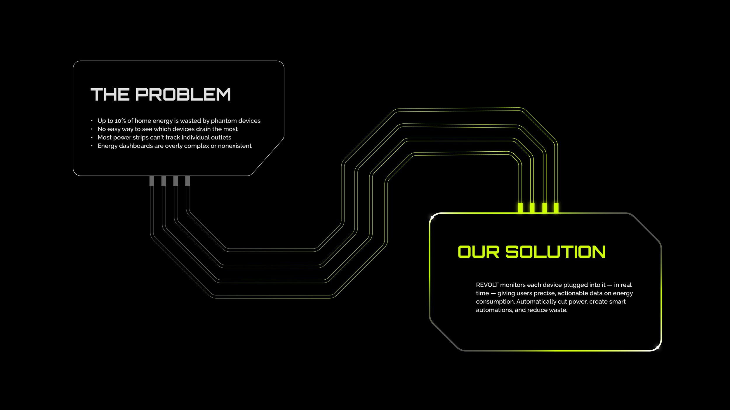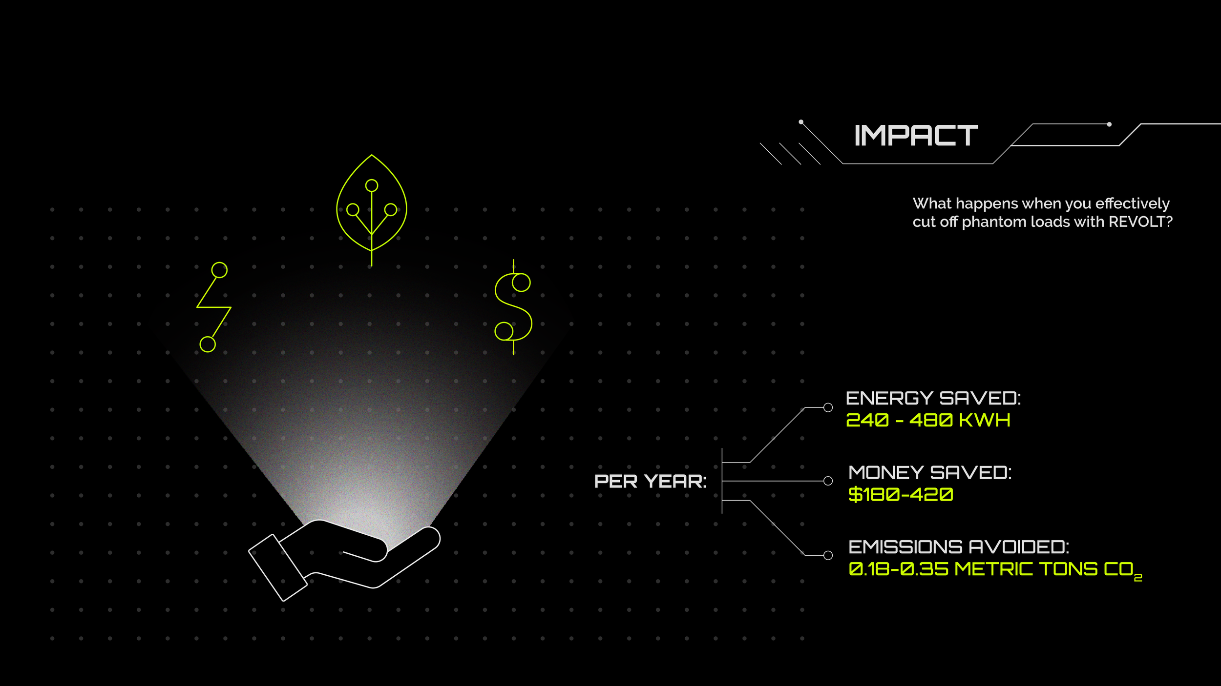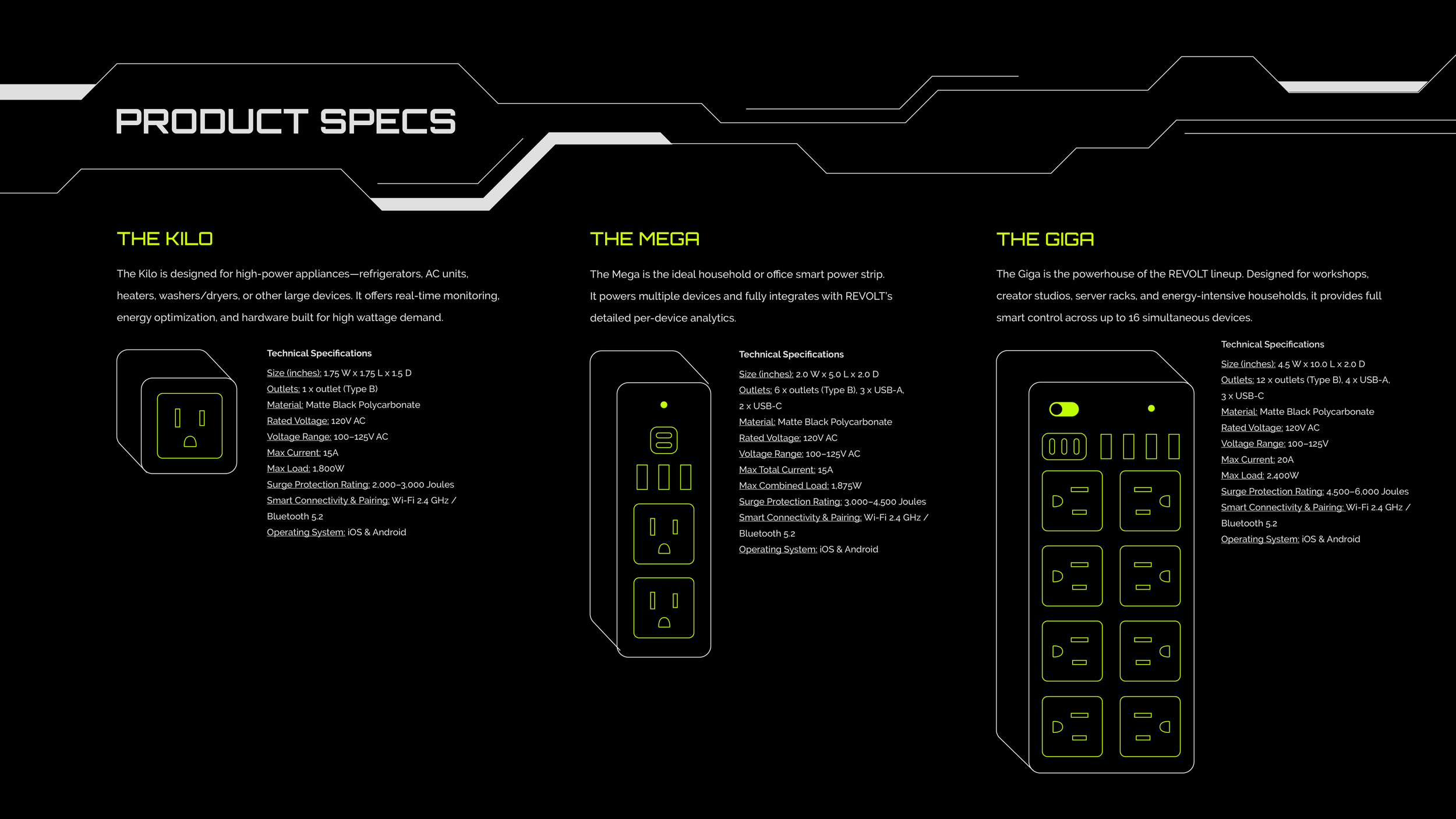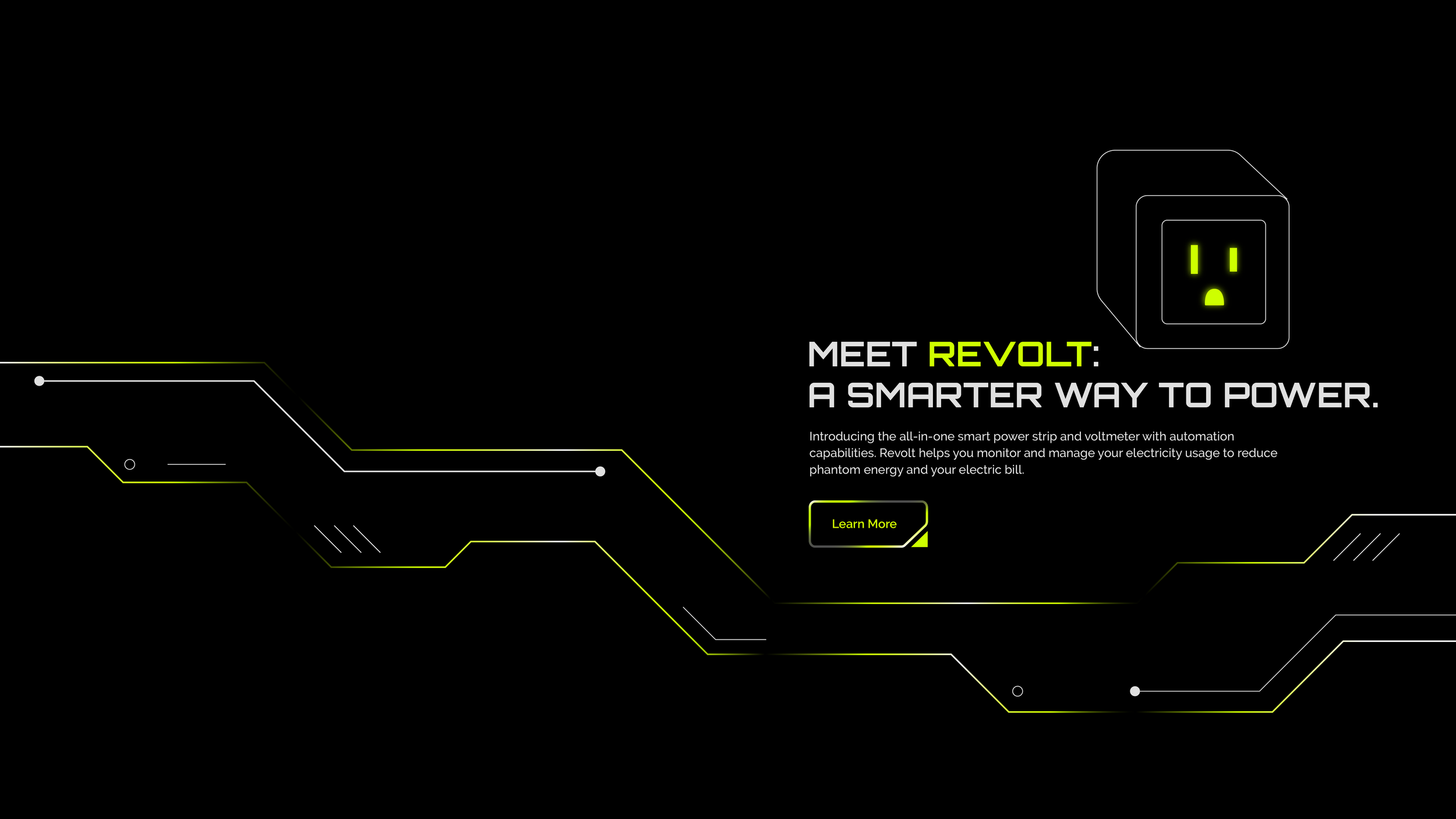 REVOLT is a fictional brand that highlights a solution to a real-world problem. This company specializes in smart power strips with monitoring and automation capabilities. These power strips give the user insights into the electricity consumption of any device, while also working to reduce phantom load, or the latent electricity that is consumed even when devices aren’t in use. REVOLT aims to give users full agency over their energy use, helping them save money and the environment. Electric green and light gray pop against a pure black background. I use linework and shapes inspired by heads-up-display (HUD) and computer chip aesthetics to emphasize REVOLT as technology of the future.