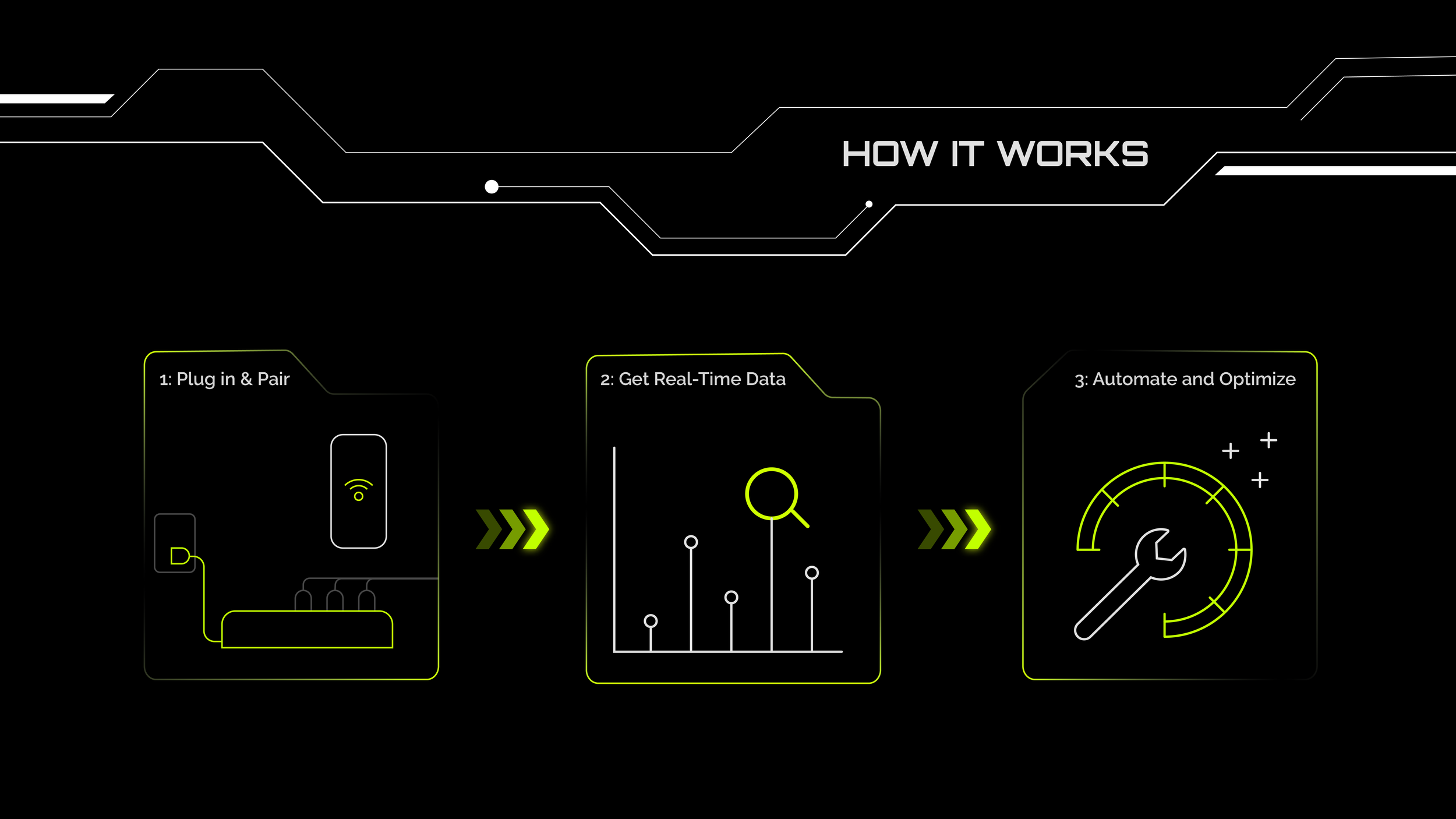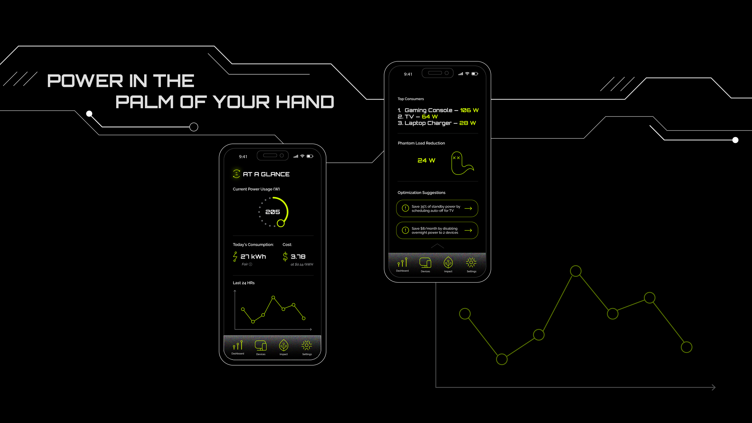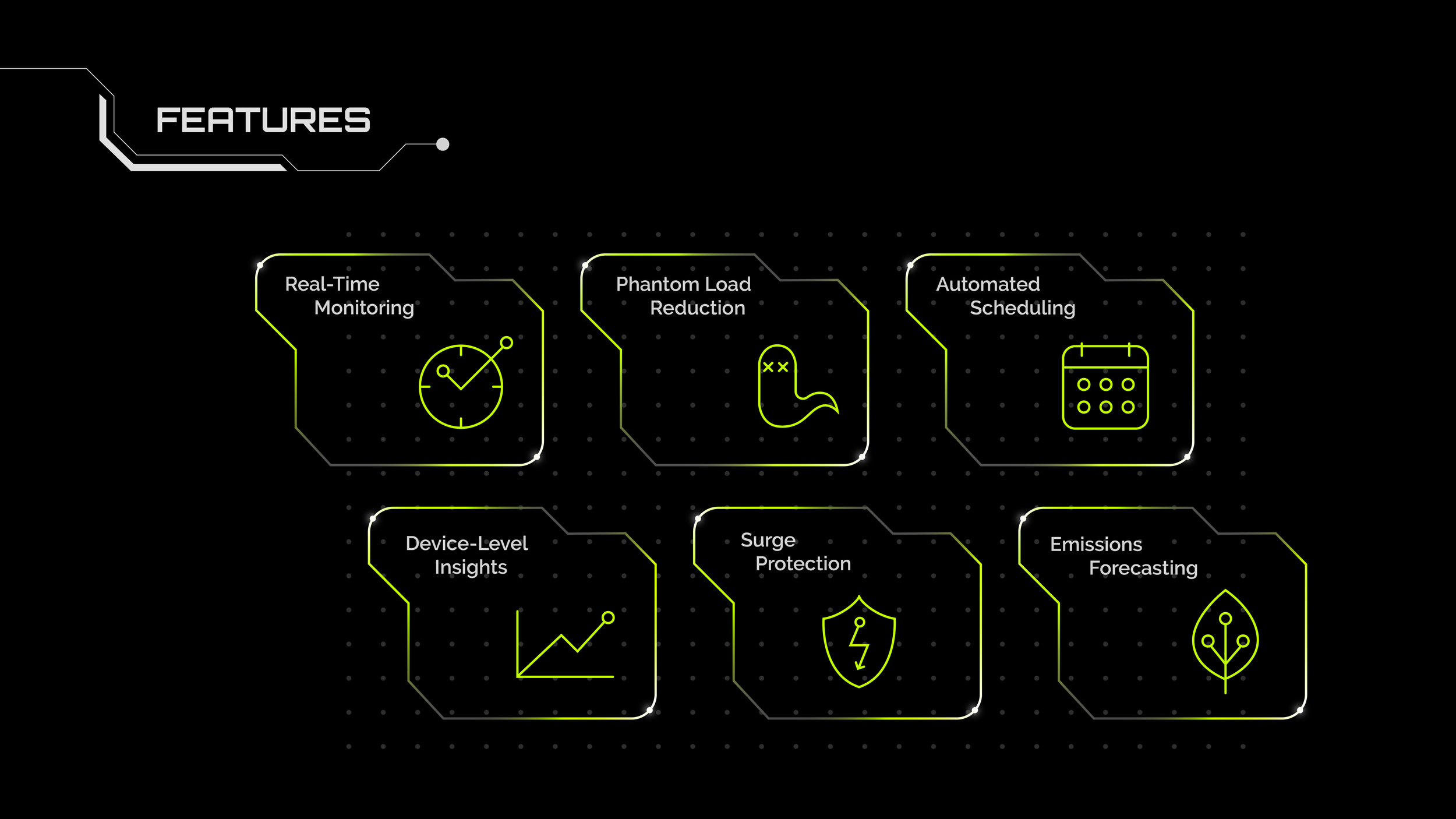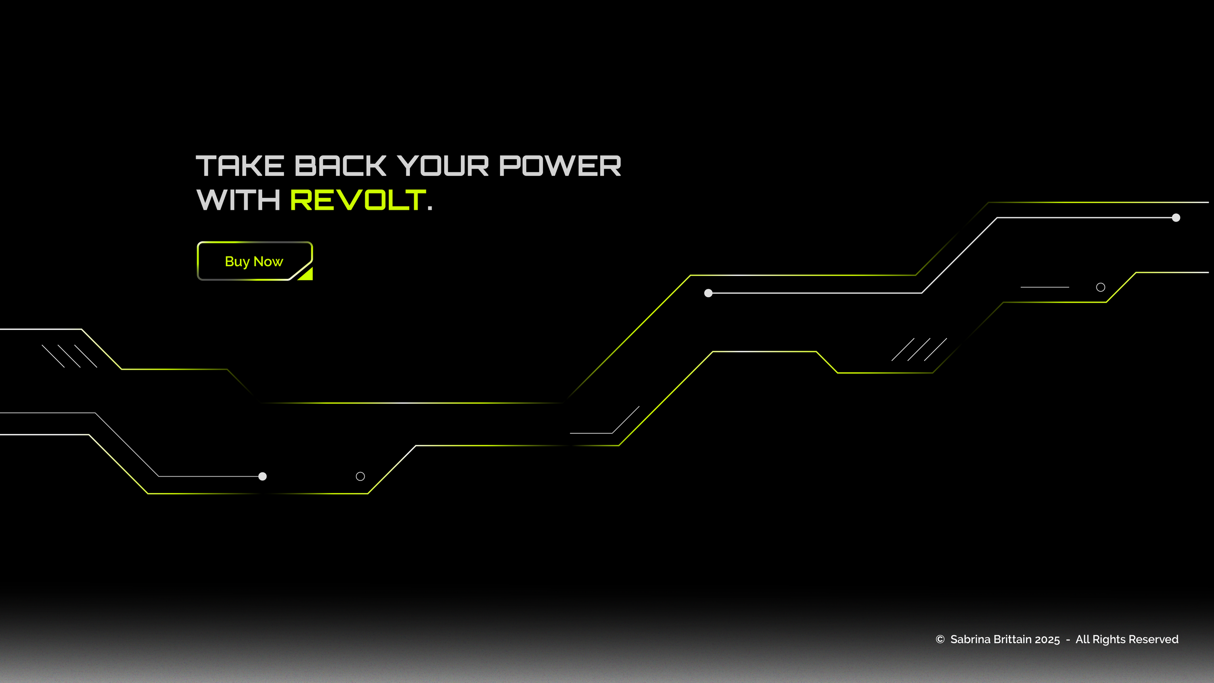 REVOLT is a fictional brand that highlights a solution to a real-world problem. This company specializes in smart power strips with monitoring and automation capabilities. These power strips give the user insights into the electricity consumption of any device, while also working to reduce phantom load, or the latent electricity that is consumed even when devices aren’t in use. REVOLT aims to give users full agency over their energy use, helping them save money and the environment. Electric green and light gray pop against a pure black background. I use linework and shapes inspired by heads-up-display (HUD) and computer chip aesthetics to emphasize REVOLT as technology of the future.