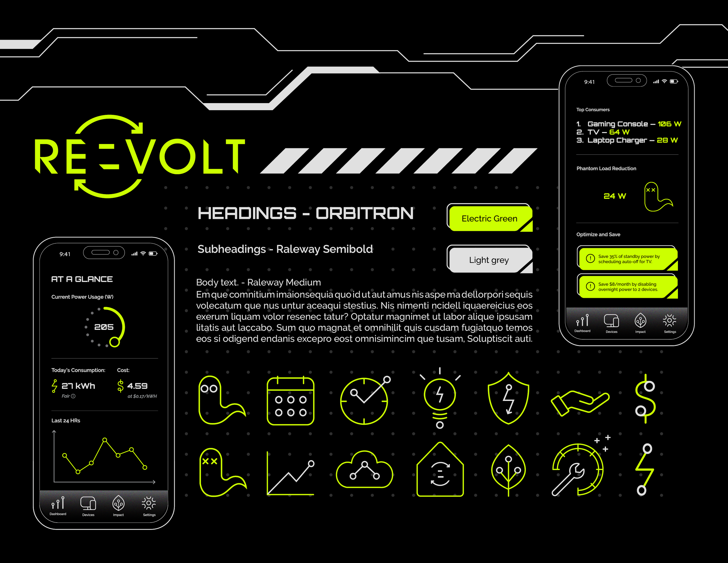 REVOLT is a fictional brand that tackles a real problem: phantom energy. This company specializes in smart power strips that give the user insights into their electricity consumption while also working to reduce phantom load that is consumed when devices aren’t in use. REVOLT aims to give users full agency over their energy use, helping them save money and the environment. Electric green and light gray pop against a pure black background. Linework and shapes inspired by heads-up-display (HUD) and cyberpunk aesthetics emphasize REVOLT as technology of the future.