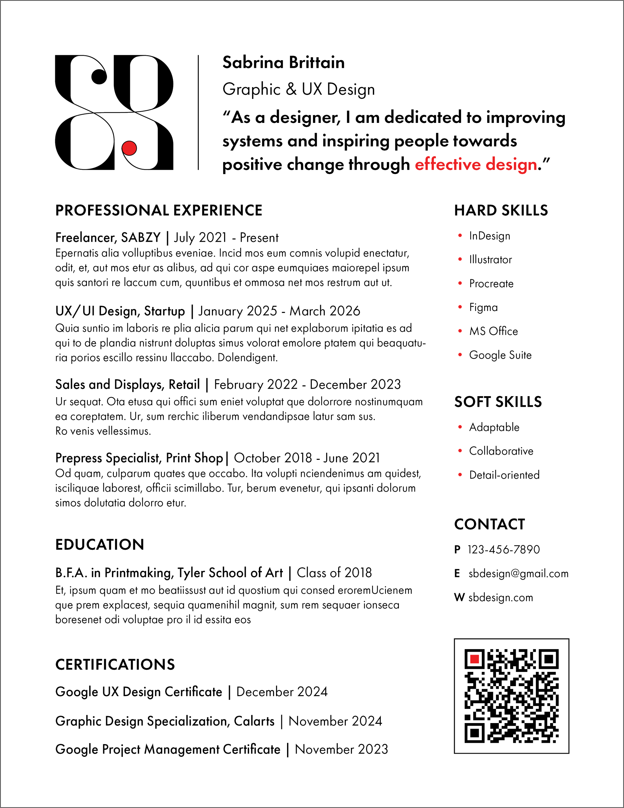 SB Design is a personal brand identity built on the principles of clarity, elegance, and thoughtful simplicity, using an almost exclusively black and white palette to emphasize clean typography and functional form while allowing key elements to speak with intentional impact. The design pairs smooth, refined curves in the logo with a geometric sans serif type hierarchy to create a visual language that communicates sophistication and professionalism. By incorporating bold red sparingly as an accent, the identity strikes a balance between subtle and bold expression, elevating the resume and business card system into a cohesive brand that feels both poised and memorable.